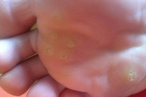 李某,60岁,农民,足底多发性鸡眼,曾用过鸡眼膏几百贴,还用过硝酸银、生石灰等,长时间治疗不当致命名左足14处,右足19处长了鸡眼,足不敢任地,垫了4层地毯剪的鞋垫,有几处他自己用刀削得太深了,不断没有去掉鸡眼,反而导致了感染。