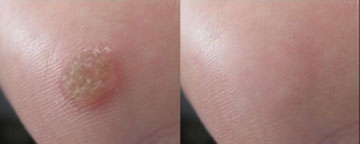 鸡眼为皮肤角质层增生呈圆锥形向真皮层伸入的肿物,好发生在足底、趾侧受压部位。一般小的鸡眼可用药物敷贴治好。对位于足跖负重部位,行走剧痛,经药物治疗无效者,或屡发感染者,在炎症消退后均应行手术切除。