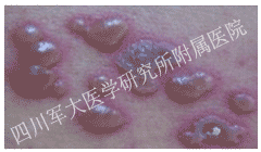 5、发病区皮肤丘疹呈带状排列,沿一侧周围神经节分布区出现,继而在红斑上生成簇状米米粒至绿豆大小的丘疱疹,并迅速变为水疱,渐渐变为血疱乃至脓疱,最后覆盖有坏死性痂皮。