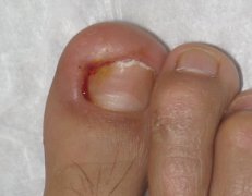 甲沟炎一般是先发生在一侧甲沟皮下,表现红肿、疼痛。一般无全省症状。如能及早治疗,炎症可能好转消退。否则病变内成脓,红肿区内有波动感,出现白点,但不易破溃出脓,炎症还可以发生于甲跟处或扩展到另一侧甲沟,感染加重时就常有疼痛加剧和发热等全身症状。由于指甲阻碍脓性物排出,感染可向深层蔓延而形成骨髓炎。