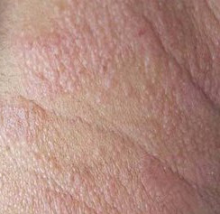 4. 螨虫性皮炎:患者皮肤变粗糙,有脱皮现象。在夜间面部会有瘙痒感。面部多油,毛孔变粗大,鼻周毛孔有黑头并增多。青春痘反复发作,鼻上痤疮反复发作,毛血管扩张,皮肤开始增生性肥厚,呈“橘皮状”红肿。前胸、后背生出红色小疙瘩。还出现断发、头发分叉,头皮屑增多等等。