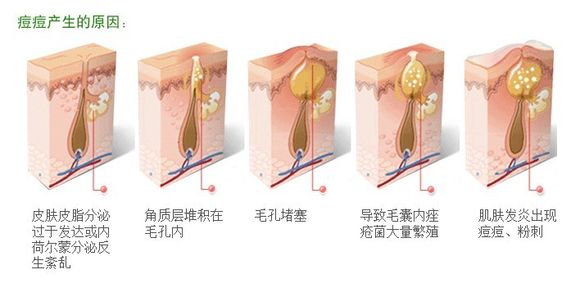 首先,肌肤受体内荷尔蒙的影响而过度出油,容易造成毛孔堵塞。而肌肤角质层因为内分泌的原因没有正常代谢而变得厚重时,油脂就无法正常排出。而毛囊中的痤疮棒状杆菌、葡萄球菌等微生物也在此时会滋生,痘痘就开始形成了,当痘痘受到微生物的刺激,就会引起炎症,从而出现红肿等现象。