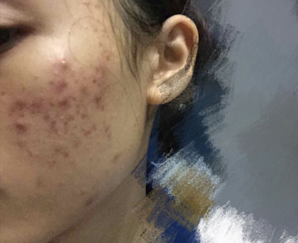 18岁那年,患者脸上开始冒出青春痘。当时,以为是平时不注重保养,才会长青春痘。紧接着,保湿的、紧肤的、祛痘的化妆品一股脑地买了回来。那些化妆品使用后,青春痘的症状不但没有缓解,反而更加严重,左右脸及额头上都长满了。红痘摸起来疼,整张脸看起来就像被“八宝粥”泼过。