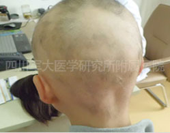“刚来的时候头上很油的,发亮,检查时毛囊口亮亮的,全是油脂,堵住了,连小头发都没有。”接诊阿美的正是四川军大皮肤科的刘祖华主任,他介绍说,“她头发基本上脱的没有了,稀稀拉拉的,眉毛、睫毛也基本上脱的没有了。”
