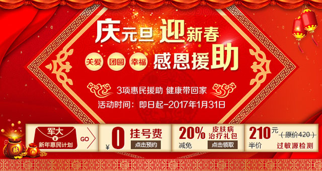 年终临近,辞旧迎“新”,佳节来临而以神经性皮炎、湿疹、银屑病等为代表的皮肤病也进入高发期。为了让广大市民倍有“面子”的过好春节,即日起成都军大医院特推出“庆元旦迎新春,感恩援助”活动。以检查援助、治疗减免等惠民举措福泽蓉城百姓。凡在2017年1月到院患者均可享受惠民活动。