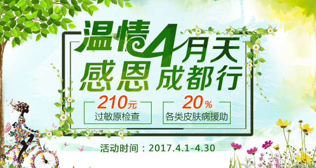 温情四月天,草长莺飞,燕语呢喃,万物复苏,正是百花盛开。时下,天气阴晴不定,气候反复无常,干燥和潮湿反复交替,而大部分的时间气温不高不低,最适合病菌繁殖,所以,很多皮肤疾病就容易在春季发生。为感谢市民对军大医院的关注,切实体现军大医院“惠民、利民、为民”的服务宗旨,让更多市民关注自身皮肤健康,增强自我健康意识。在4月,我院将举办“温情四月天 感恩成都行”优惠活动,推出多项优惠套餐。借此本次活动帮助患者摆脱疾病困扰,并解决百姓“看病难,看病贵”的问题。