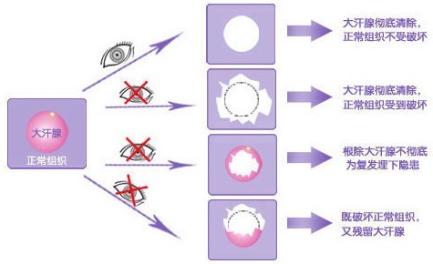 1、由于人体腋窝下有300-600个大汗腺,要想治疗,首先必须要精准定位每个大汗腺,并分辨、分离出含异味的大汗腺,才能做到不漏诊漏治,给复发留下机会。