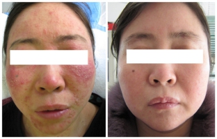 患者信息:蔡某燕,46岁,2014年7月患脂溢性皮炎,反复发作,给生活和工作造成严重影响,面部鳞屑影响容貌,曾数月不出门。
